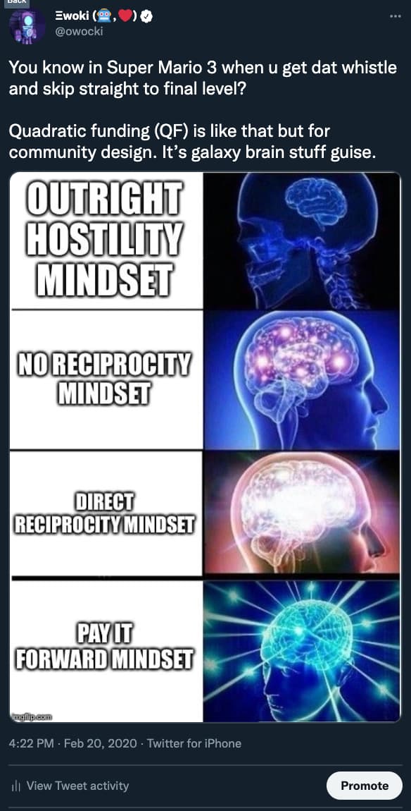Gitcoin tested this mechanism with its "Townsquare" activity feed in early 2020, running 14 successive weekly QF rounds: