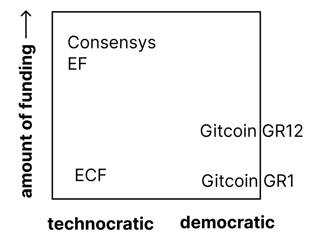 | Technocratic = small group of decision makers | At the ECF/EF, you had to go through a grantmaking process where a small committee would decide if you got funding. At Consensys, you had to be hired by Joe Lubin or his disciples. |
