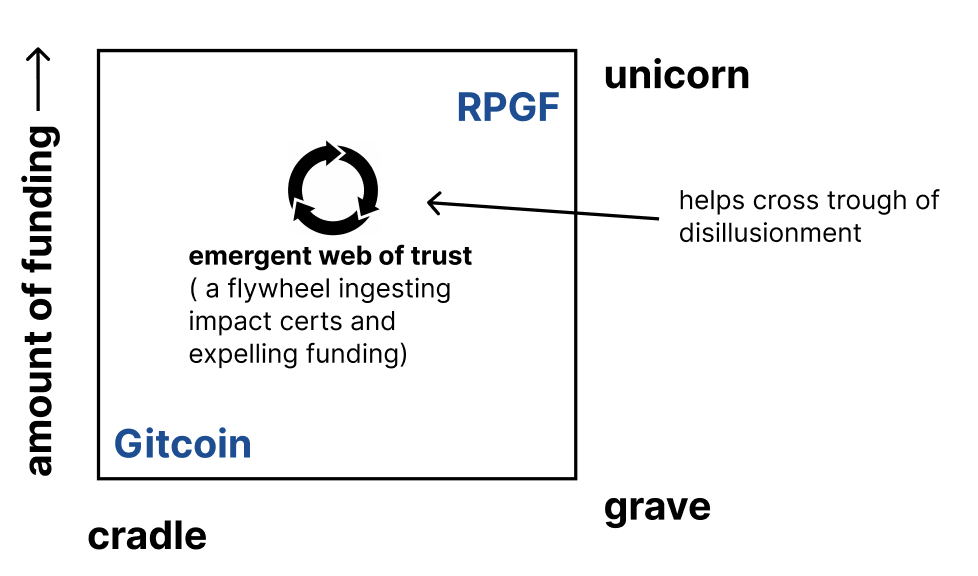 - Map out spectrum of public goods funding from cradle-to-grave (or cradle-to-unicorn) for each project.